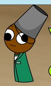 Brud is a brown Sprunki with black derpy eyes, brown eyelids, and thin eyebrows. He wears a gray bucket on his head.